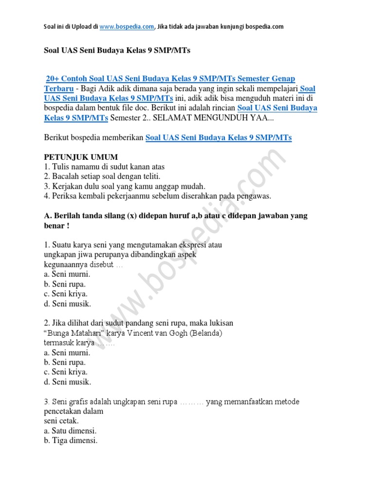 Kisi Kisi Soal Dan Kunci Jawaban Ukk Seni Budaya Smp Kelas 7 Kurikulum 2006 Didno76 Com from 1.bp.blogspot.com Maybe you would like to learn more about one of these? Soal karya seni rupa 3 dimensi. Check spelling or type a new query. We did not find results for: