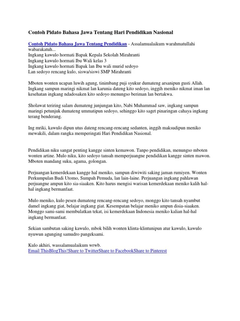 contoh pidato bahasa jawa tema budi pekerti.berikut ini kita akan menuliskan mengenai contoh pidato dalam bahasa jawa bertema narkoba. Wektu jam 0300 wektu kulon pas pasan wengi banget aku guru lan kanca kancaku padha dhunga lan maca tahlil banjur wes bar bis sekolahku mlaku ing rumah makan ing lamongan. contoh teks pidato bahasa jawa singkat padat jelas tentang perpisahan kemerdekaan lingkungan sekolah kebersihan pendidikan narkoba lengkap terbaru. Dibawah ini adalah contoh naskah pidato bahasa jawa tentang pembukaan bazar semoga dengan adanya contoh naskah pidato ini baik panitia maupun penyelenggara acara bazar dapat terealisasikan keinginan dan harapannya melalui acara bazar tersebut. Contohnya adalah anda, jadi bahasa krama inggil adalah panjenengan.