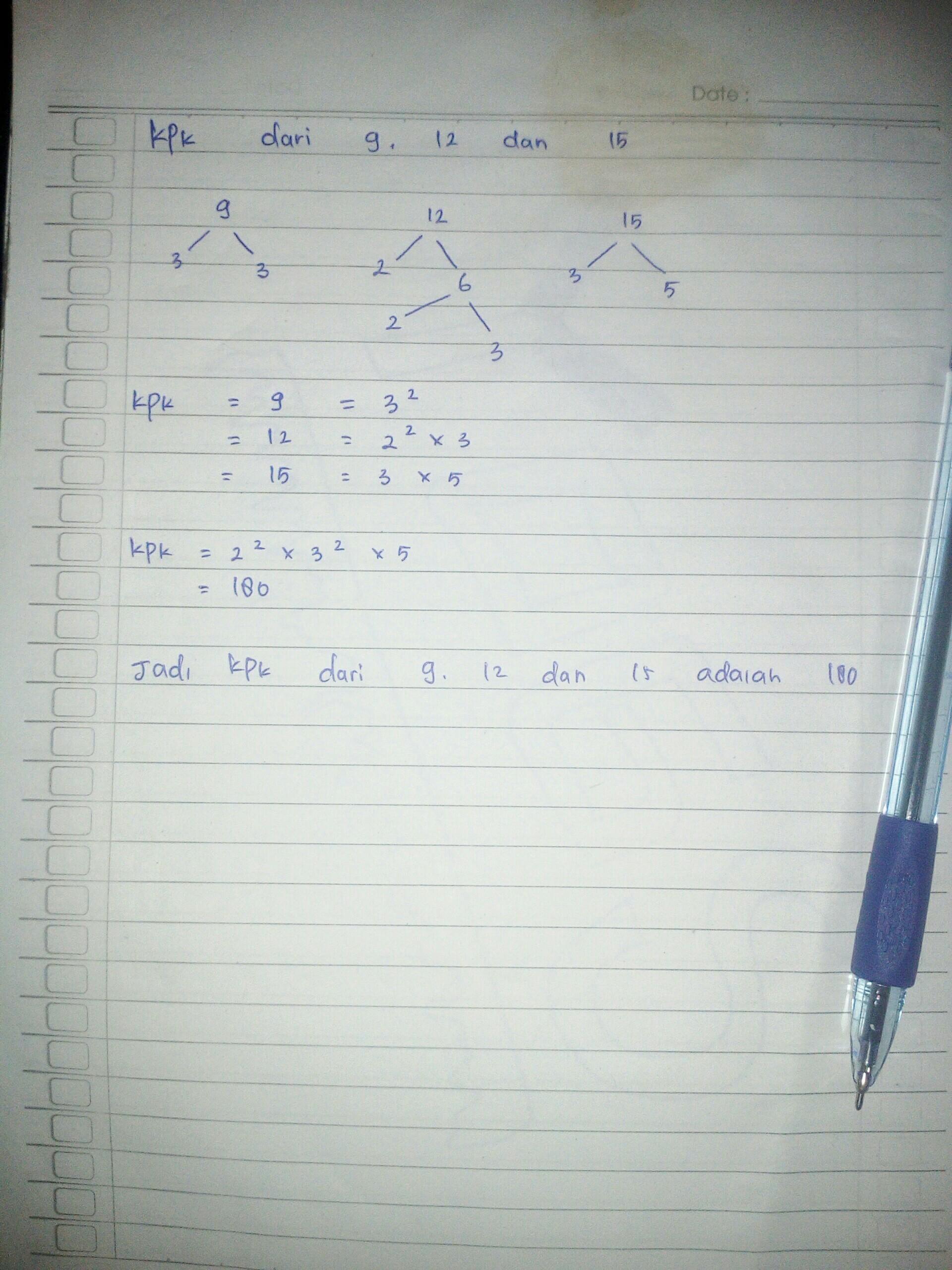 Kpk dari 12, 15 dan 45 = 2² x 3² x 5 = 4 x 9 x 5 = 180. Jan 10, 2016 · jenius. Oct 20, 2014 · ambisius. Fpb dari 20 dan 25 adalah. Mar 02, 2020 · faktorisasi prima dari 10 adalah 2 x 5 faktorisasi prima dari 15 adalah 3 x 5 faktorisasi prima dari 20 adalah 2² x 5.
